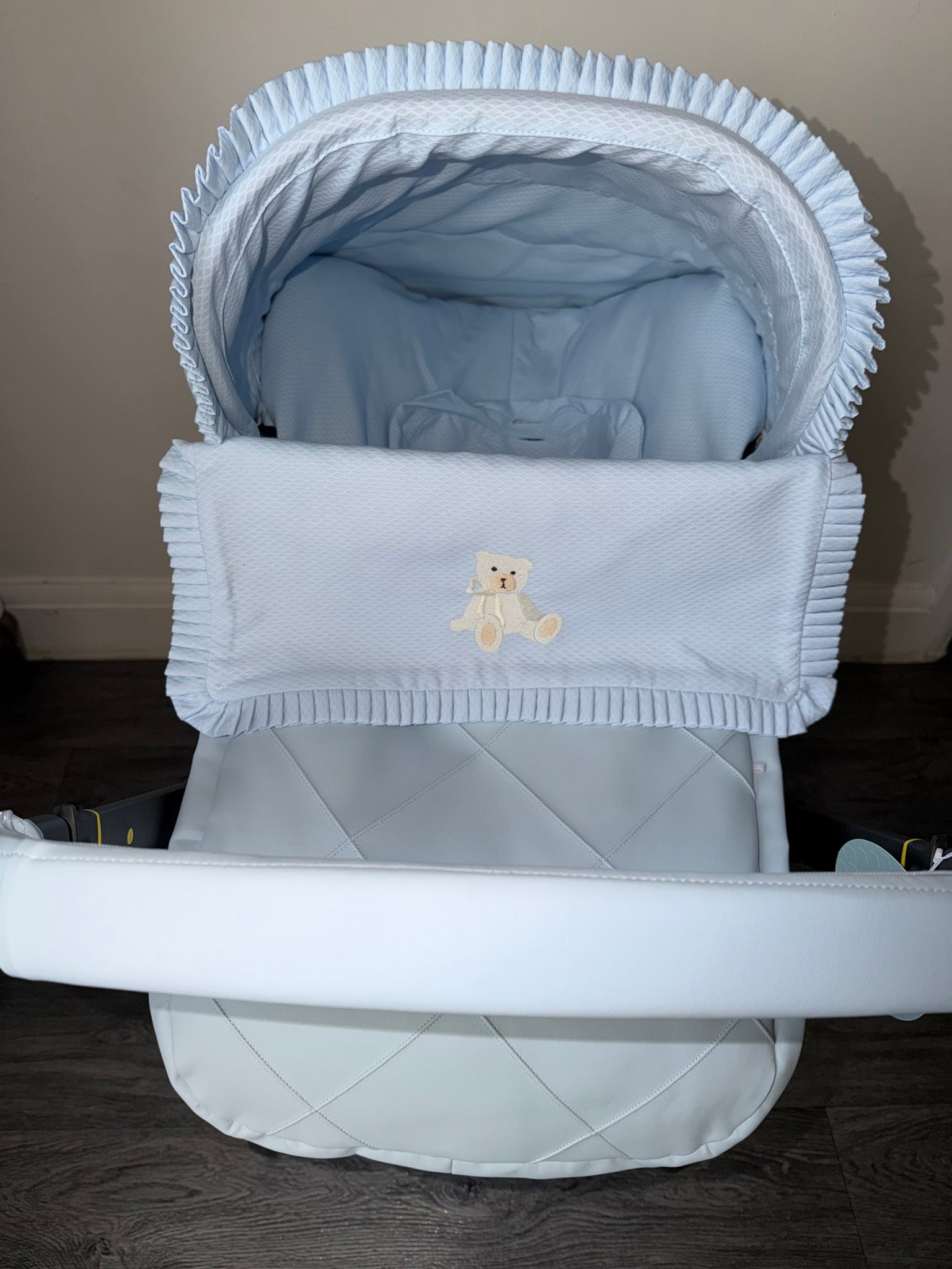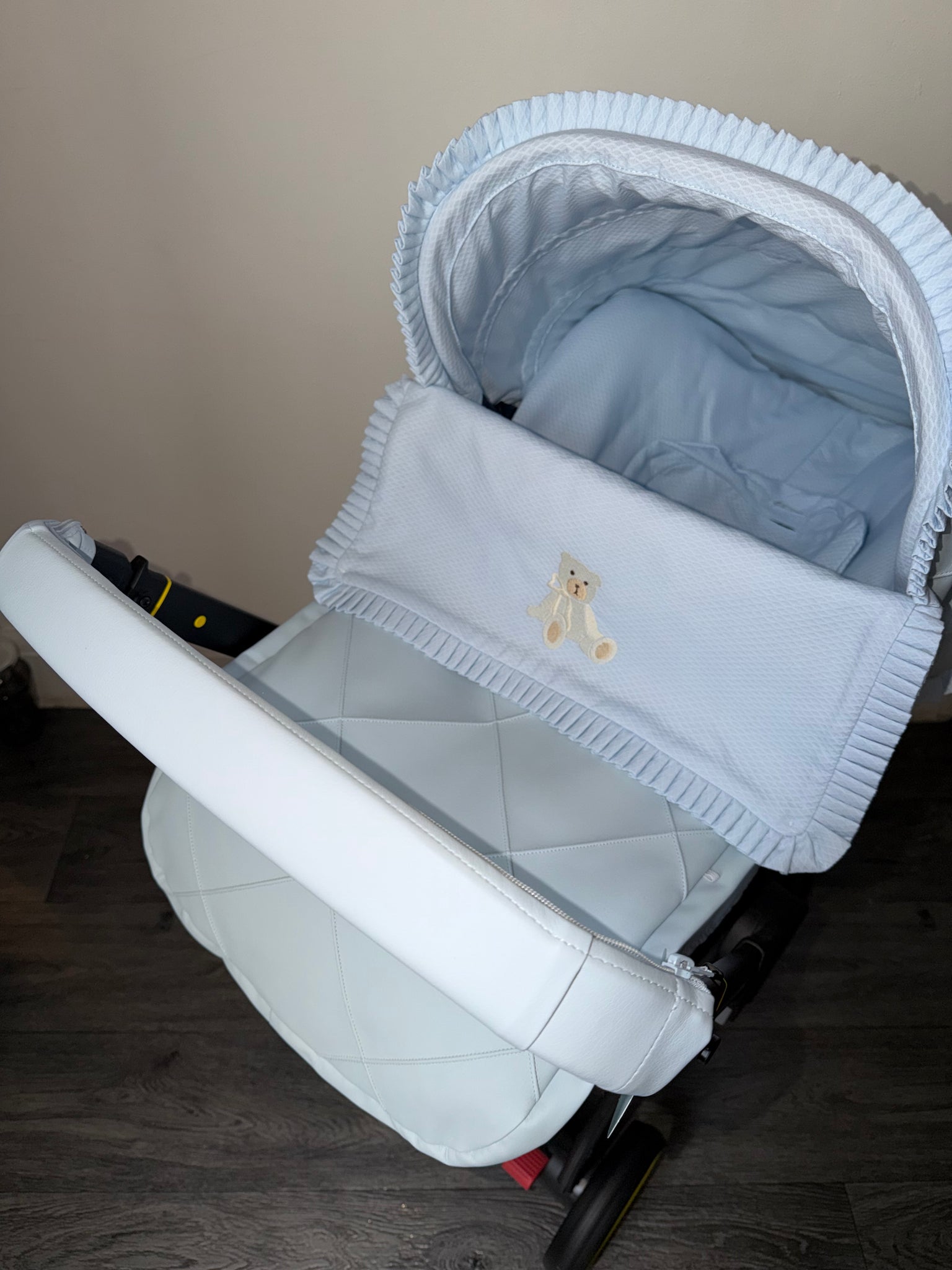 Car seat set includes hood, footmuff/liner headrest and straps