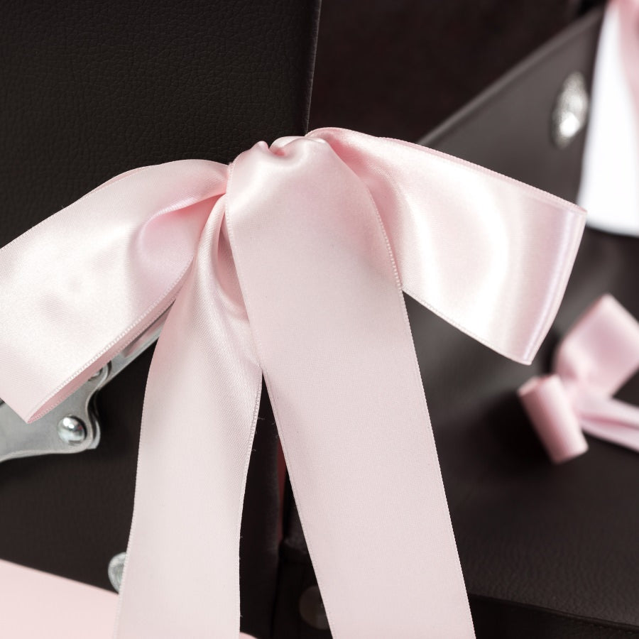 Includes baby blue satin bows to wear the hood and decorative grosgrain bow on apron. Nappa leather bag included.